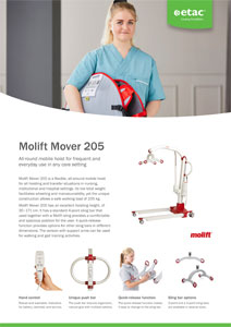 All-round mobile hoist for frequent and everyday use in any care setting Molift Mover 205 is a flexible, all-around mobile hoist for all hoisting and transfer situations in nursing, institutional and hospital settings. Its low total weight facilitates wheeling and manoeuvrability, yet the unique construction allows a safe working load of 205 kg. Excellent reach, low and high Molift Mover 205 has an excellent hoisting height, of 30–171 cm. It has a standard 4-point sling bar that used together with a Molift sling provides a comfortable and spacious position for the user. A quick-release function provides options for other sling bars in different dimensions. The version with support arms can be used for walking and gait training activities. Ergonomic handling The Molift Mover 205 is equipped with Molift’s unique push bar that provides multiple and flexible grip possibilities for improved caregiver ergonomics. Molift Service Tool Like all Molift hoists, it is equipped with a unique service notification system that notifies when service is required. The integrated service software can also display data about hoist usage and can assist service technicians in troubleshooting. Additionally, the hoist is equipped with Bluetooth connectivity, enabling wireless connection to Molift Service Tool. |